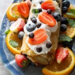 Nutella Filled Crepe Roll Cake - sweet breakfast , brunch or dessert cake made with rolling freshly made crepes and nutella