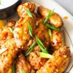 Chicken wings- Drying the chicken wings will make sure that the wings do not stew instead of "frying" and get a nice browning on them.Baking Powder - It may seem weird, but it will really make the chicken wings extra crispy! Make sure it's not clumpy; otherwise, you will end up tasting bits of baking powder, and that's not fun at all!Air fry - It is life-changing to make wings and potato fries in the air fryer. Unlike the oven, the air fryer crisps up anything quickly and with literally no oil! I strongly suggest buying one.Chili Flakes- You can adjust the amount of chili flakes based on your tolerance. I have used mild chili flakes, but I have to say my son finds it spicy. Other options are fresh peppers, fresh green chilies, cayenne pepper, and my favorite, smoked paprika. Hot honey sauce - This sauce comes together in less than 3 minutes! Sometimes, sauces are difficult to balance, but this one is quite easy to make. You can drizzle it over pizza, yogurt, or morning toast or toss tofu in it. There are endless ways to use it up!Serving- Serve the wings hot, right after tossing with ay dips you have on hand.I like it with creamy cooling dips like my 5 minute yogurt dip, green onion dip or even a quick aioli like the chimichurri aioli or sriracha lime aioli.